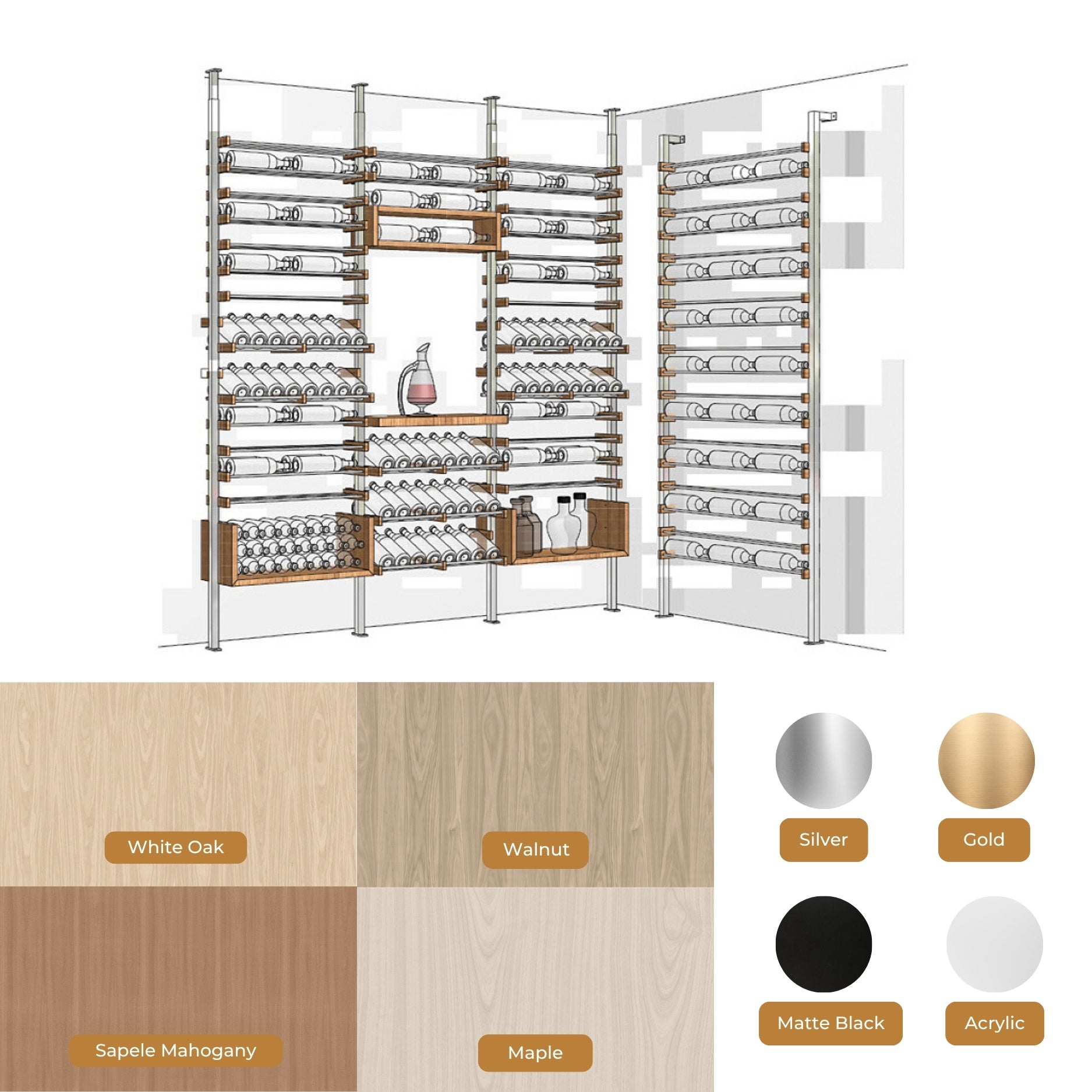 While we only offer the Walnut wood & Silver metal combination online, we have more material options available through our Cellar Specialists. All our vignettes are available in White Oak, Walnut, Sapele Mahogany, or Maple wood and Silver, Matte Black, Gold, or Acrylic metals.